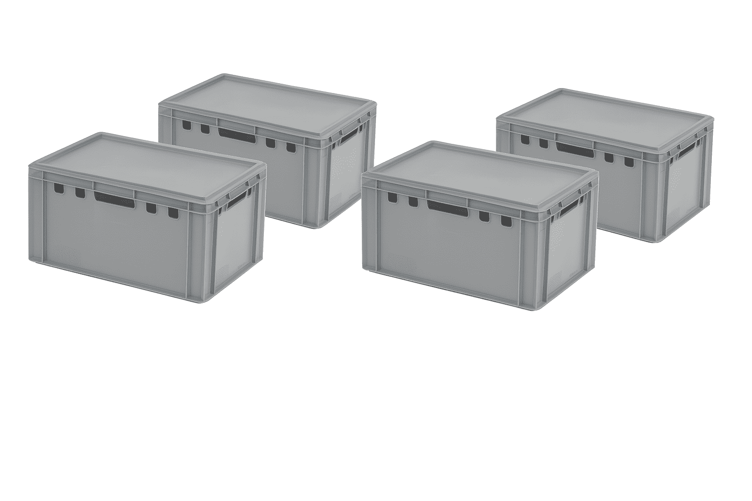 Unser Sparpaket mit 4 Kisten im Format 600 × 400 × 300 mm und in der Farbe Blau – inklusive 4 passenden grauen Deckeln. Hergestellt aus lebensmittelechtem HDPE Kunststoff,