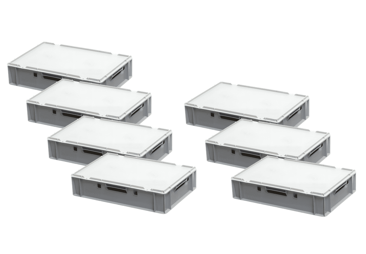 E1-Kisten 600 × 400 × 125 mm – 7er Set (Grau) Mit 7 Deckeln in Grau – sicher lagern & transportieren