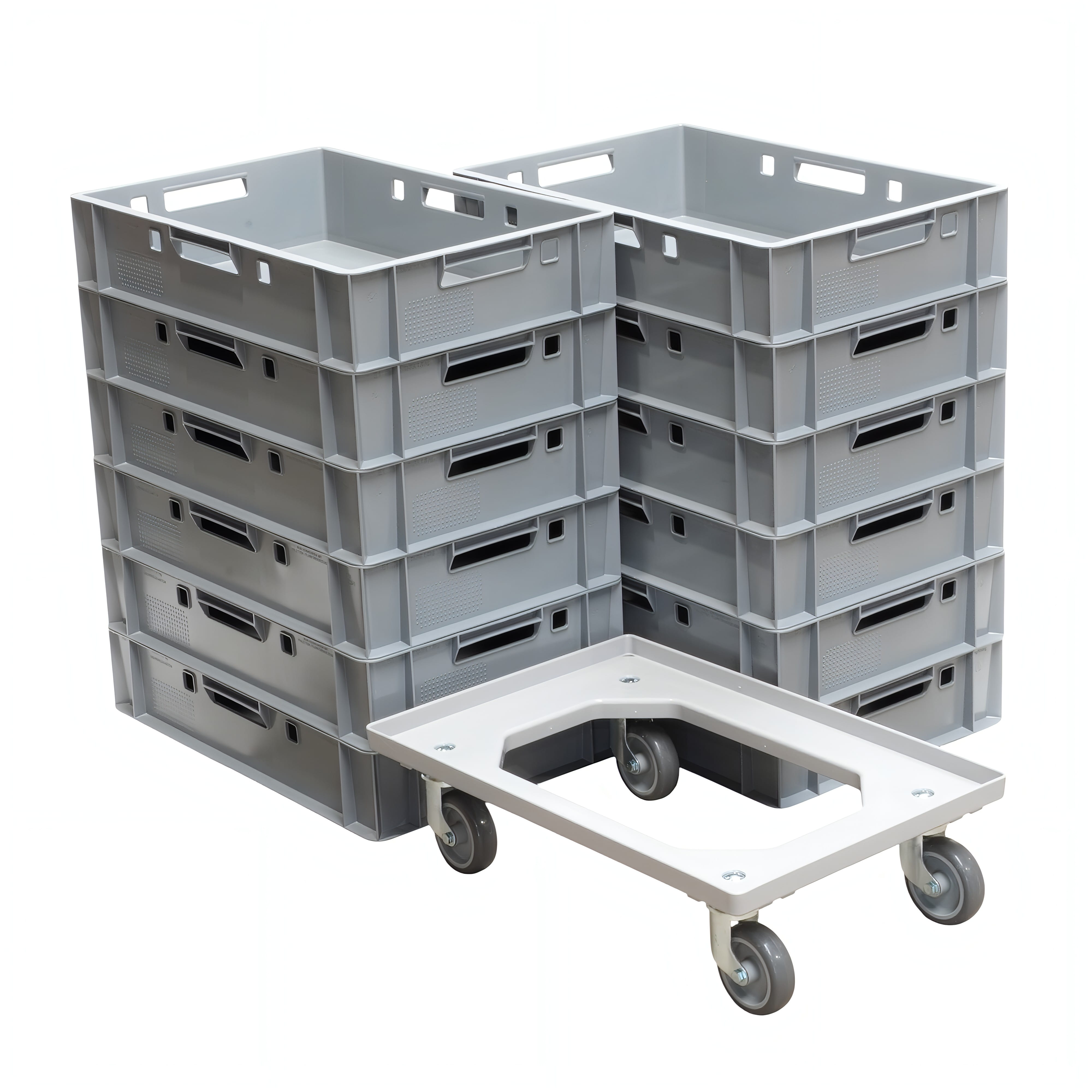 E1-Kisten 600 × 400 × 125 mm – 12er Set + Transportroller Typ C in Grau